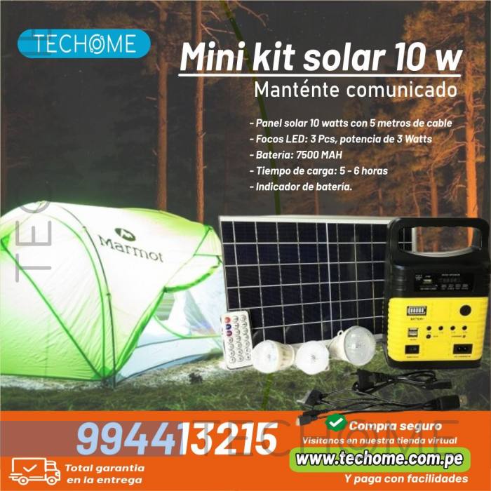 Ideal para los campamentos o lugares de poco acceso a la corriente.Con los Mini Kits solares Ademas, de estar conectado usted estar contribuyendo a la conservacion del medio ambiente.